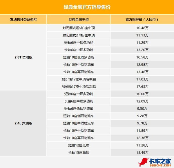 要了解这两款车,大家仍有必要先了解一下他们之间的区分。经典全顺经典全顺按轴距来分,有短轴、长轴和加长轴;按顶高来分,它还可分为低顶、中顶和高顶;再加上座位数量的不同,经典全顺全系车型共计多达29款!而新全顺推出了短轴低顶、中轴中顶两种车身形式的共12款车型供选,车型细分不像经典全顺那么复杂。