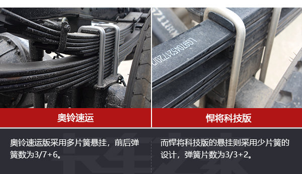 但在轻量化设计与承载性平衡方面,奥铃做得更到位,在轻量化材料大面积使用的情况下,承载性上仍然使用了直通梁和多片簧悬架,能够最大化发挥奥铃速运版的载重性能。