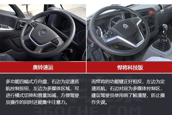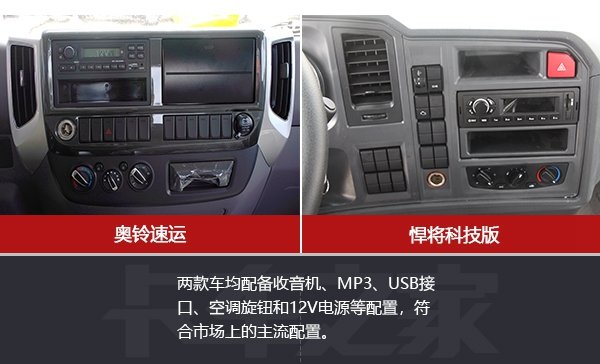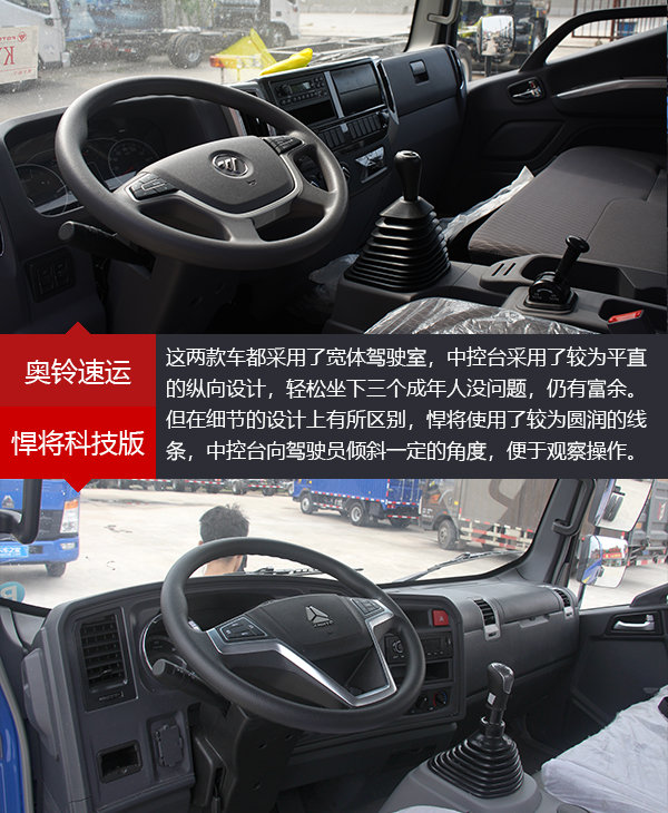 这两款车都采用了宽体驾驶室,虽然悍将要比奥铃速运内部宽20mm,但这点已经可以忽略不计了,所以两车在驾乘空间上势均力敌。两车都作为对应品牌旗下的高端轻卡,它们内饰设计和配置上都大同小异,符合一般用户的需求。