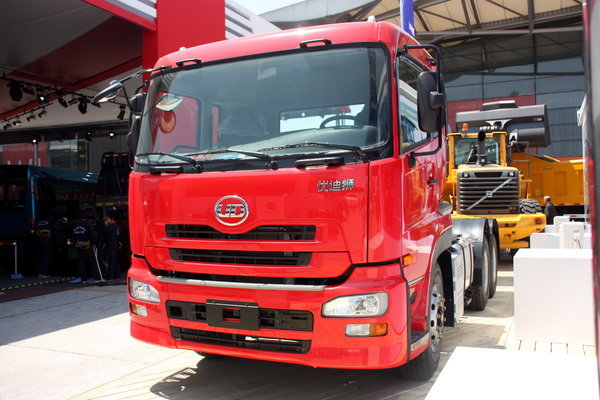 【卡车之家 原创】2011上海车展中,东风日产柴公司并入沃尔沃集团展台,其展出的优迪狮DND4253系列牵引车,外观上延续日产柴久远QUAN卡车的华丽造型。