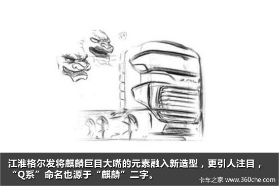 格尔发Q系全新驾驶室的设计灵感来源于中国古代瑞兽麒麟图腾。巨目大嘴的特点,颇具震慑性的视觉效果。“Q系”命名也源于汉字“麒麟”。