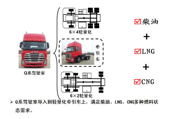 Q系驾驶室导入轻量化牵引车上,满足柴油、LNG、CNG多种燃料状态需求,既能满足长途公路牵引需求,也能应用于港口牵引,体现了重卡车型节能、环保的趋势。