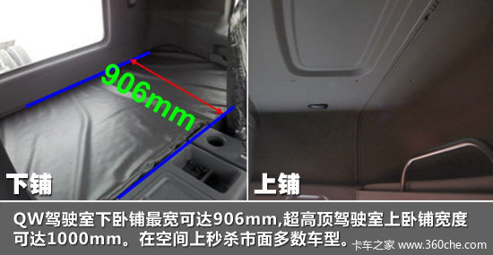 国内最大的驾驶室匹配了国内最宽的卧铺,能让司机的长途旅行提高一个星级。在过去两年,天龙850mm加宽卧铺被江湖号称为“史上最宽卧铺”,在市场上颇有卖点。而新Q系的推出,让江淮刷新了国产车最宽卧铺的记录。格尔发QW驾驶室下卧铺最宽可达906mm。另外,QW超高顶驾驶室的上卧铺也有了改进,宽度增加200mm,可达1000mm。