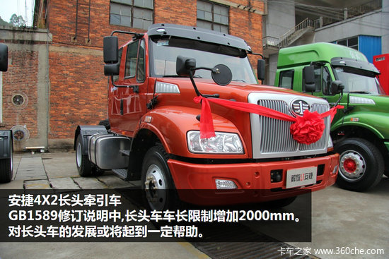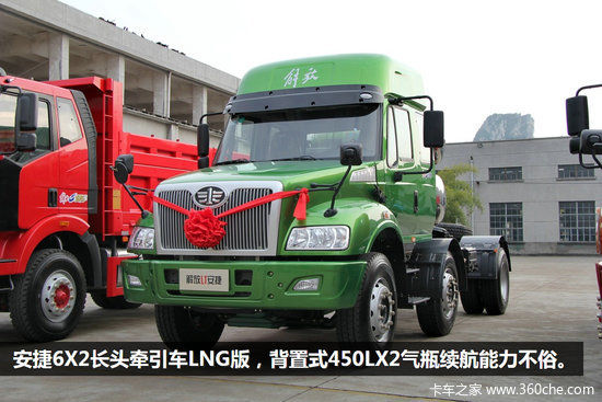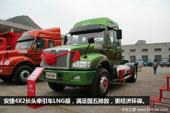 安捷长头牵引车是解放第三代长头重卡,在2013年年底正式上市,经过一年时间的不断升级和完善,在本次年会上推出了装载奥威11L发动机420大马力的车型,填补了市场空白。安捷长头牵引车拥有柴油和天然气、4X2/6X2/6X4车型、平顶和高顶驾驶室、220~420马力的全系列配置。柴油系列产品达到四排放标准,天然气产品达到国五排放标准,可以满足不同用户的各种需求。