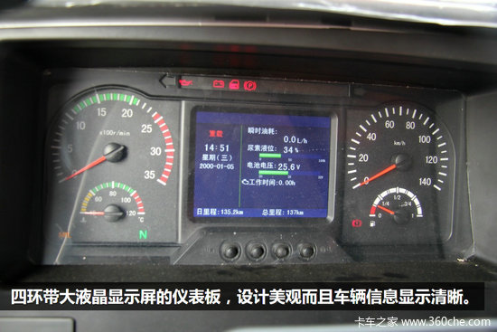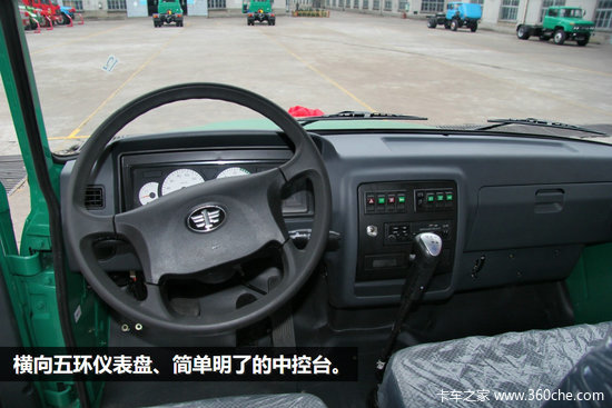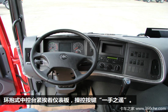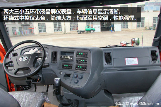 标配的四幅方向盘,简单实用;两大三小五环带液晶屏仪表盘,车辆信息显示清晰;环绕式中控仪表台,简洁大方;标配军用空调,性能强悍。6X4车型将配备定速巡航功能,降低驾驶员驾驶强度。