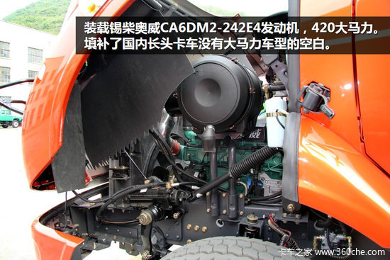 这款6X4车型搭载的是锡柴奥威CA6DM2-242E4发动机,排量11L,420大马力,在1100-1400RPM之间能提供最大1900N·m扭矩输出。采用集成式冷却、滤清模块化设计,机身结构紧凑。标配锡柴的大功率发动机制动,同时可选装排气制动装置,使车辆在重载长坡时更安全,减低驾驶员制动操作疲劳度,提高制动系统寿命。匹配法士特12JS200TA铝合金超速档变速箱,满足420马力澎湃输出,同时降低自重。