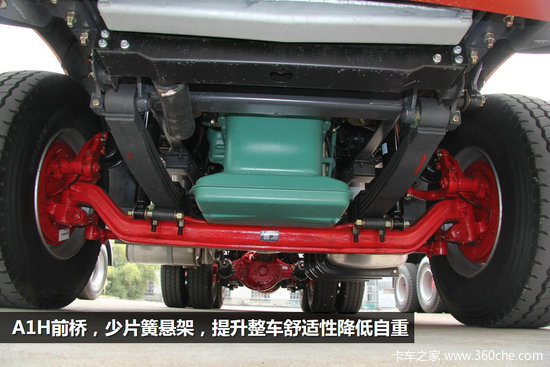 前桥为解放A1H前轴,驱动桥为蓬翔的457双后桥,速比为4.11。前4后4少片簧悬架,提升整车舒适性降低自重。标配ABS制动系统,配合发动机制动和排气制动,整车制动性能有保障。车架为300X90X(8+5)的双层车架,满足车辆承载性需求。