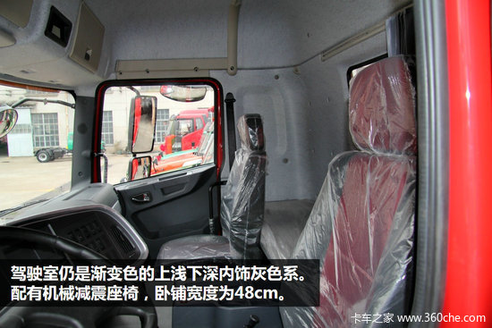 驾驶室仍是渐变色的上浅下深内饰灰色系,标配有机械减震座椅,卧铺宽度为48cm,对体型较大的用户来说就略显狭窄了。