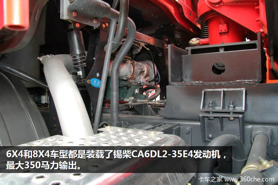在动力方面6X4和8X4车型都是装载了锡柴CA6DL2-35E4发动机,8.75L排量,350马力,最大1500N·m扭矩。可选法士特12档直接档或超速档变速箱,动力输出衔接平稳可靠。车架经抛丸烘干工艺处理,承载能力强,8X4车型可选承载性能超强的300X90X(8+8+5)三层车架。