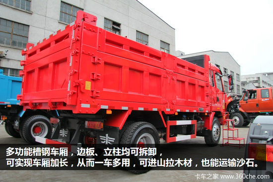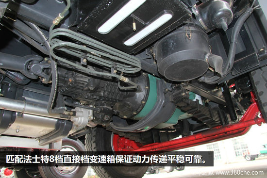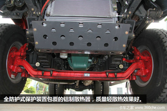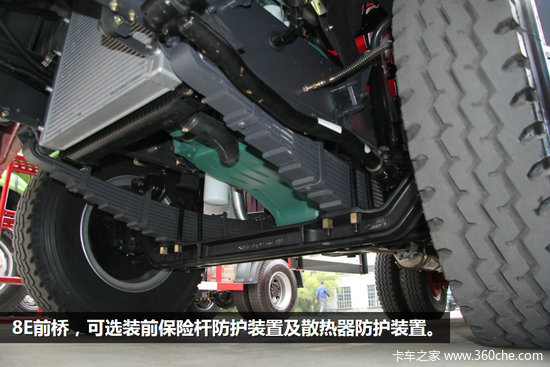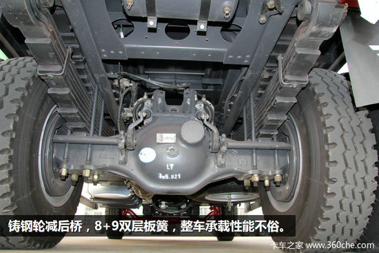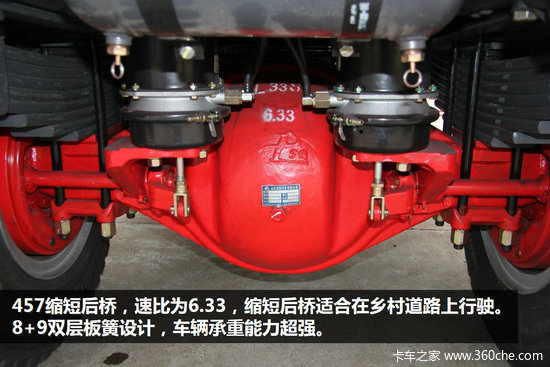 前桥为8E前轴,驱动桥为457缩短后桥,速比为6.33,缩短后桥适合在乡村道路上行驶。前后多片簧悬架,前悬10片簧后悬为8+9双层板簧设计,车辆承重能力超强。根据使用环境,还可选用CA6DF4系列180马力和220马力发动机、加强钢板、加厚双层车架。