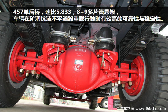 AIH前桥,457单后桥,速比5.833,前后加强多片簧悬架,保证车辆在矿洞坑洼不平道路重载行驶时具有较高的可靠性与稳定性。