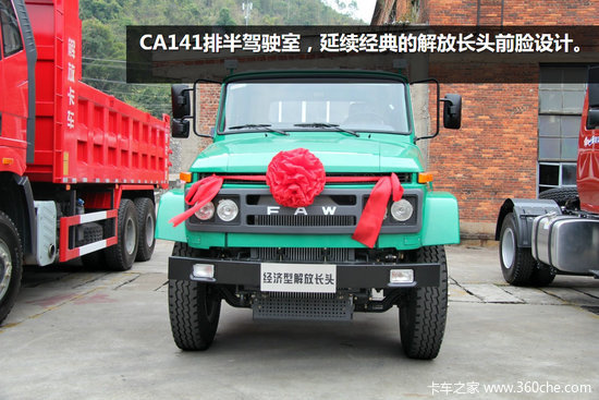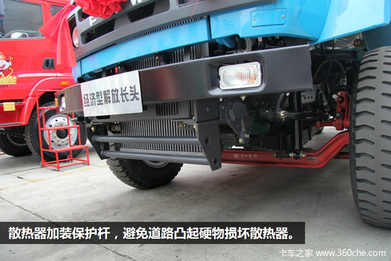 柴油版装配CA141排半驾驶室,经典的解放长头前脸,分体式大灯、转向灯、进气栅依然延续下来。下部延伸出来的散热器标志着它的发动机早已经升级到更大马力,为了保护下部冷却模块安全,装了金属保护罩。