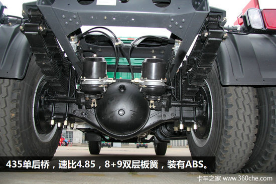 标配解放142单前桥、435单后桥,速比4.85。前悬为10片簧,后悬为8+9双层板簧,能提供超强的承载能力。标配ABS,其制动系统功能阀与解放J5P通用,质量稳定可靠。
