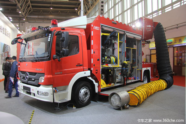 室内的奔驰底盘的消防车实在太多了,不过有一款来自安普的多功能排烟照明消防车还是给小编留下深刻的印象。此车采用的是奔驰Atego1229 4X2的底盘,此车配备了独立柴油机的109马力排烟风机,排烟机配备电动液压升降和旋转设备,排烟能力出色,侧面的储物柜采用铝杆锁卷帘窗,救援器材十分丰富。