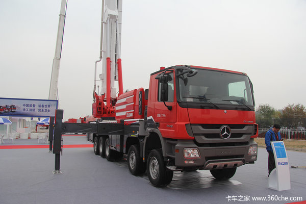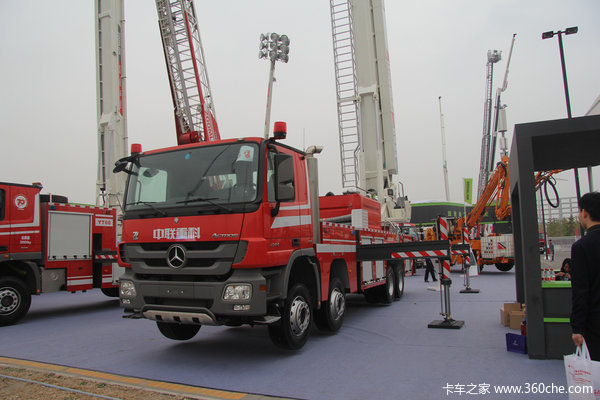 首先来到的是中联重科的展台,中联这次携7款消防装备产品闪耀亮相展会,其中就包括了2辆奔驰底盘的消防车,其中一款是采用了奔驰Actros4144底盘的54米登高平台消防,高空救援性能卓越。