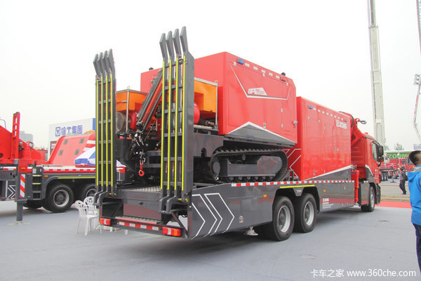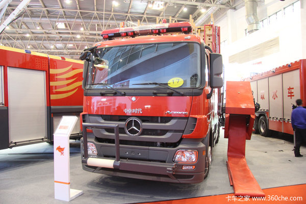 在消防展的室内展台展出了多款奔驰底盘的消防车。这款车是中卓时代展示的远程供水消防车。采用了奔驰Actros2636底盘改装,侧面安装有消防水带,水带接口具备自动感应能力,水源输送距离达6000mm,系统额定流量在24000—30000L/min,在遇到洪涝灾害以及火灾、缺乏水源时发挥重要的作用。
