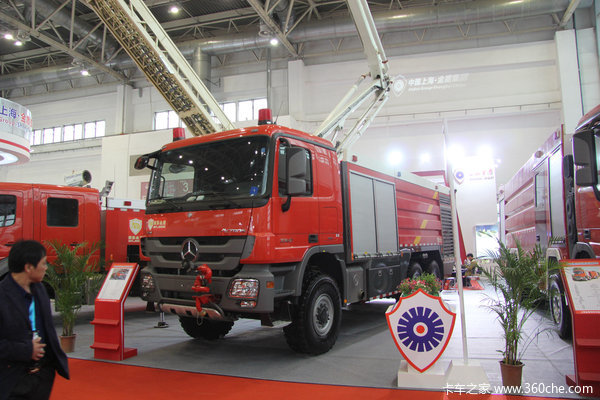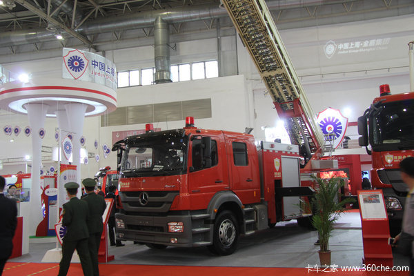 消防展室内现场金盾森田也有亮相了多款奔驰底盘的消防车。其中包括了采用奔驰Axor底盘的轻型快速云梯车,最大的工作高度达到30米,主要是负责高空的救援任务。