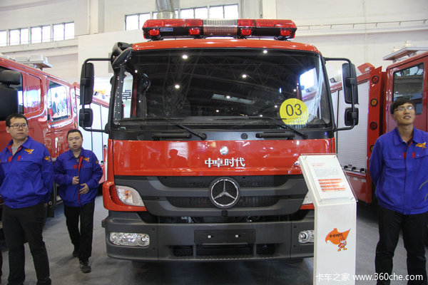 这是中卓时代展出的奔驰Atego底盘城市主战消防车。此车外廓尺寸长X宽X高为6350X2400X3200毫米,发动机的最大输出功率210kw,285马力动力强劲,最高车速能够达到110km/h;携带多种应急救援器材,并且拥有独特的自动受水系统,灵活快速完成城市消防工作不成问题。