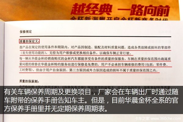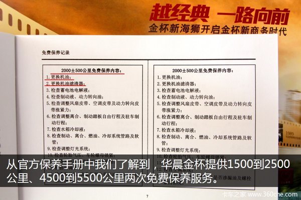 从官方的保养手册中我们了解到,华晨金杯提供2000±500公里、5000±500公里两次免费保养服务。免费服务包括免收材料费和工时费,如果未能在规定的里程范围进行免费保养服务,用户将不享受该次服务,免费保养只能在华晨金杯特约服务站进行。前两次免费保养后,基本上每行驶5000公里为车辆做一次定期保养,定期保养的费用则要由用户自己承担。