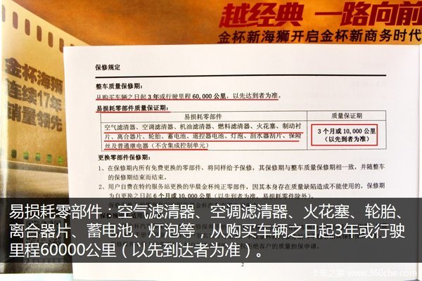 另外,厂家为华晨金杯新海狮提供3年或60000公里的整车质量保修(以先达到者为准)。其中,易损耗零部件的质量保证期为3年或10000公里(以先到者为准)。