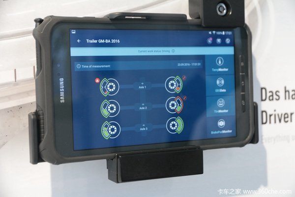 目前在国内已经能看见挂车胎压监测系统,但是对于挂车制动系统的监测技术还没有出现。在汉诺威车展上,BPW展出了用于监测制动系统的技术,该技术可以实现对制动系统的刹车片的磨损程度、制动温度进行监测,车主可以通过cargofleet Driver App获取数据,根据刹车片的磨损量决定对车桥制动系统何时进行维修保养。