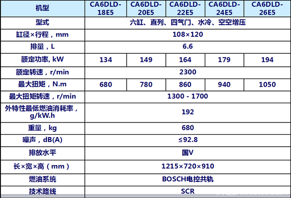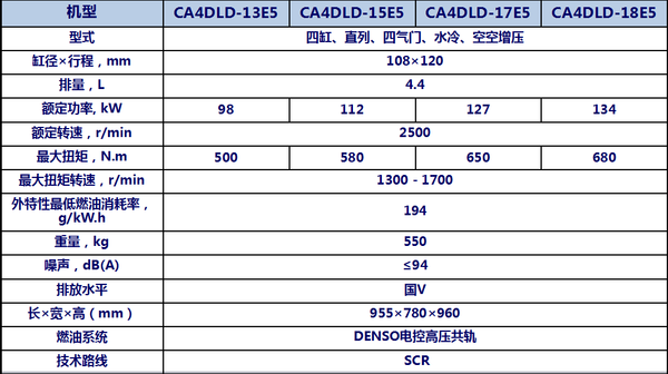 锡柴恒威CA4DLD系列柴油机是为适应高端中卡市场、适应国内排放、适应高爆压低油耗的发展趋势面开发的新一代恒威系列平台产品,全面继承了奥威发动机优势,做到真正的低油耗、高可靠、动力强的产品理念。从参数上来看,功率输出为130-180马力,最大输出扭矩为500-680牛米,通过SCR后处理系统满足国五排放标准,这个参数表现来看与同级别发动机相比有着不错的动力表现。