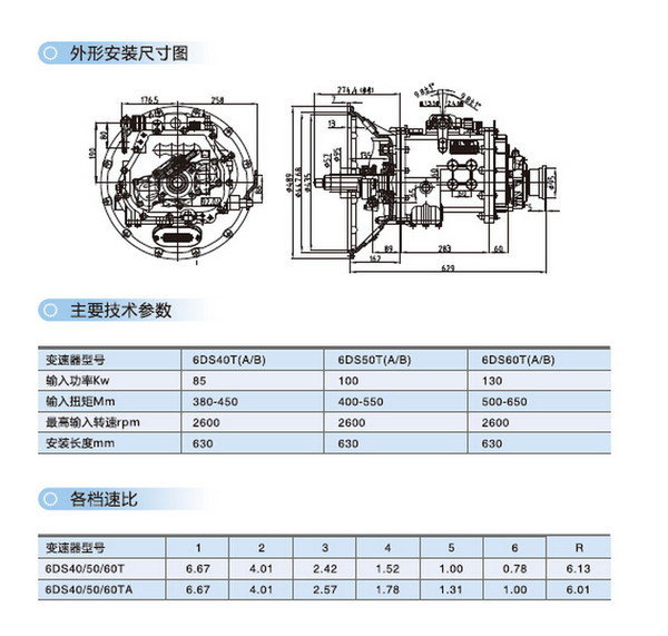 6DS40T中的6代表这个变速器有六个前进档,DS代表的是双中间轴产品(J代表的是机械传动变速箱,单中间轴),数字40代表的是输入扭矩400N.m,T代表的是变速箱带有同步器。