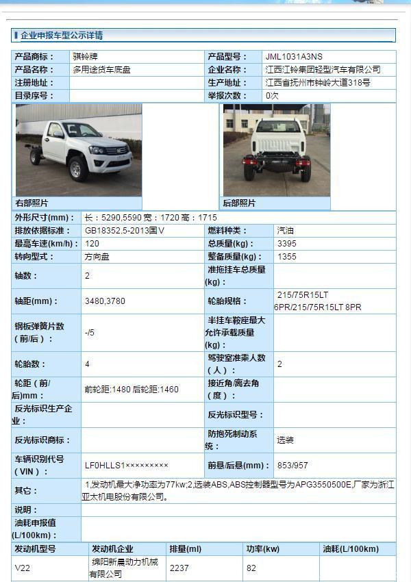这个系列的货车底盘型号为JML1031A3NS,采用了单排座椅的设计。