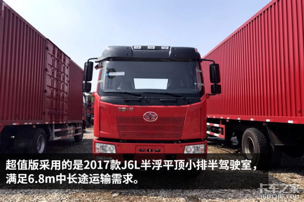 超值版采用的是2017款J6L半浮平顶小排半驾驶室,满足6.8m中长途运输需求。
