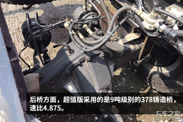 后桥方面,超值版采用的是9吨级别的378铸造桥,速比4.875。