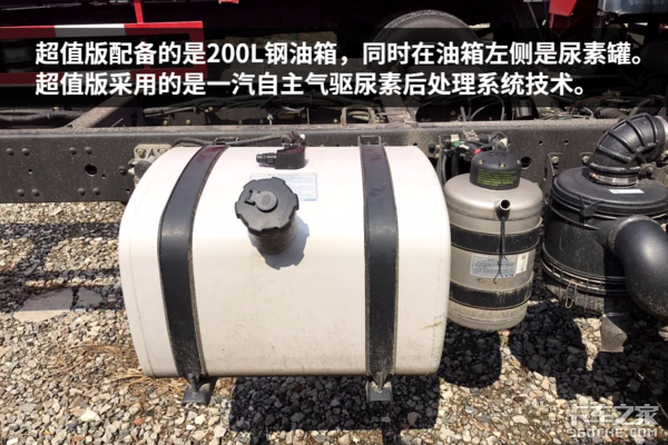 超值版配备的是200L钢油箱,同时在油箱左侧是尿素罐。超值版采用的是一汽自主气驱尿素后处理系统技术,实现了后处理平台载体模块化管理和应用,排放物低于国家限值20%。