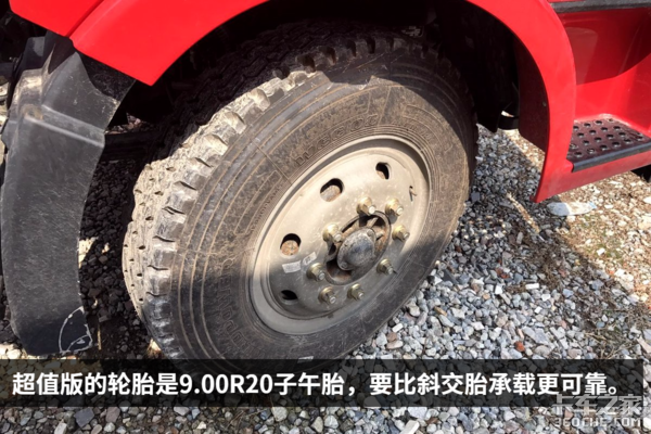 超值版的轮胎是9.00R20子午胎,要比斜交胎承载更可靠。