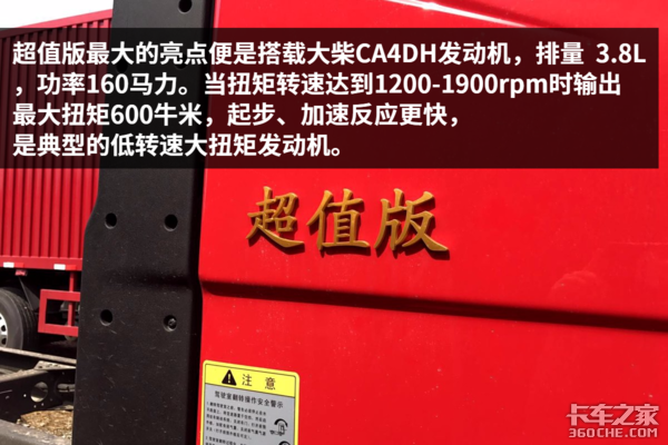 超值版最大的亮点便是搭载的是大柴CA4DH发动机,3.8L排量的四缸机,功率可达160马力。当扭矩转速达到1200-1900rpm时输出最大扭矩600牛米,起步、加速反应更快,是典型的低转速大扭矩发动机。