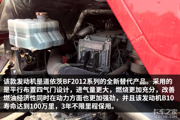 该款发动机是道依茨BF2012系列的全新替代产品。采用的是平行布置四气门设计,进气量更大,燃烧更加充分,改善燃油经济性同时在动力方面也更加强劲,并且CA4DH发动机B10寿命达到100万里,3年不限里程保用。