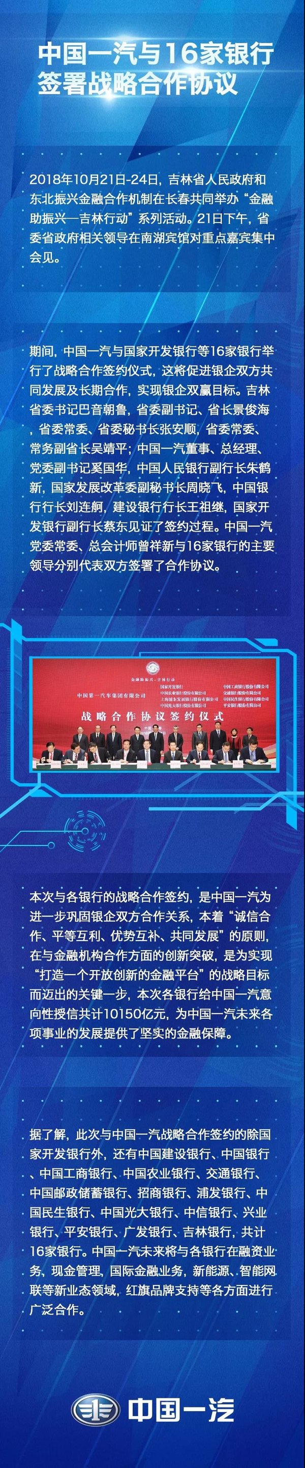 中国一汽官方微信号10月24日公布,中国一汽与国家开发银行、建设银行、工商银行等16家银行签署战略合作协议,本次各银行给中国一汽意向性授信共计10150亿元。