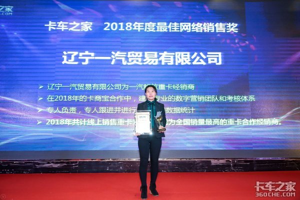 【卡车之家 原创】 2018年1月21日,在卡车之家第二届渠道数字营销盛典上,辽宁一汽贸易有限公司获得重卡组“卡车之家 2018年度最佳网络销售奖”,辽宁一汽贸易有限公司数字营销经理王美铃女士代表上台领奖。