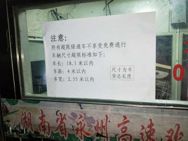 近日,湖南省永州高速公路收费站处贴出一则通知,通知指出凡是超限绿通车均不享受免通行费。