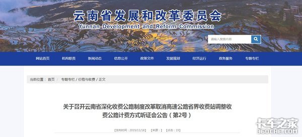 【卡车之家 原创】距离2020年到来只剩一个多月时间,高速公路按轴收费标准也正式进入了倒计时,各地省份陆续举行了关于高速公路计费方式的听证会。11月18日,云南发布了《关于召开云南省深化收费公路制度改革取消高速公路省界收费站调整收费公路计费方式听证会公告(第2号)》,将于12月3日举行听证会,讨论新的计费方案。