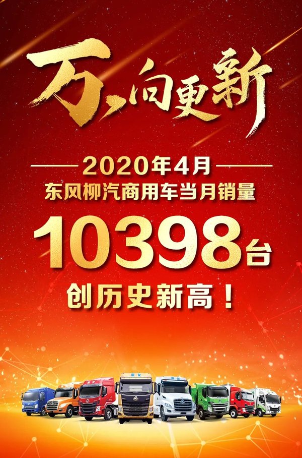 在经历连续三年的销量突破新高之后,2020年4月,东风柳汽乘龙月销10398台,创历史新高!