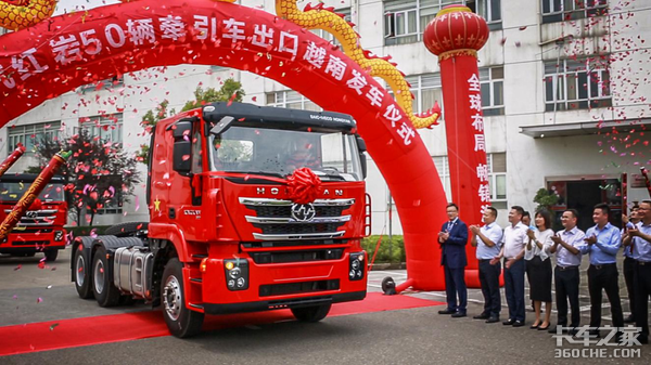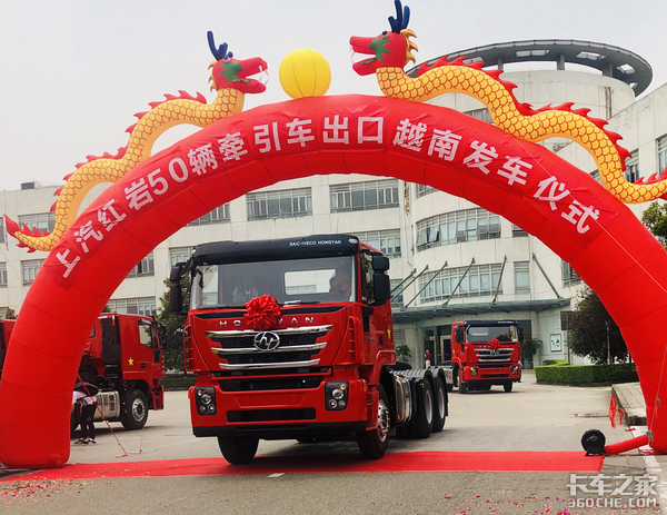 与290台军车一起发车的还有50台越南地区的牵引车,据介绍,年初,上汽依维柯红岩商用车有限公司(以下简称“上汽红岩”)与越南大客户一次性签订了100辆重卡的战略合作协议,6月13日,其中的50辆红岩牵引车从上汽红岩重庆生产基地正式发往越南,批量投入到东南亚中南半岛区域跨境物流运输服务。