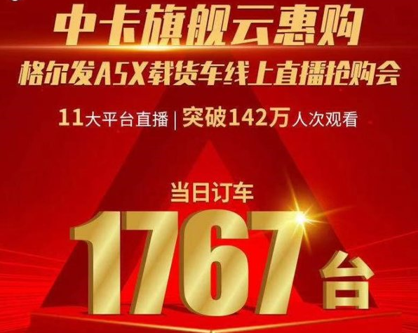 2020年7月28日,以“中卡旗舰 云惠购”为主题的江淮格尔发A5X载货车线上直播抢购会全网多平台同步直播圆满收官,行业十大媒体同步转播,142万名商用车用户线上观看直播,共同见证格尔发中卡旗舰全新升级发布。直播1小时期间,江淮格尔发携多重好礼回馈格尔发新老用户,以现场斩获1767台的订单掀起中卡用户的抢购热潮。