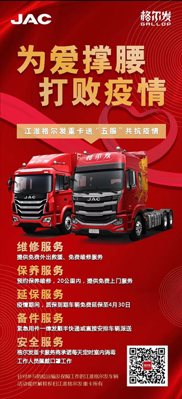 2月份,江淮格尔发推出“五服”政策,即疫情期间,针对参与防疫物资、生活保障物资运输的江淮格尔发车辆,格尔发承诺为其提供维修、保养、延保、备件、安全共计五方面的升级服务。“五服”政策的推出有效保障了防疫运输及保障工作,在这场人与病毒的抗战中,江淮格尔发积极承担起企业的社会责任。