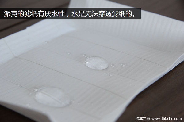为了测试滤纸对水的过滤能力,我从拆开的滤芯上剪了一块滤纸下来,并直接往上边倒了一点水,大家可以看到,水并没有透过滤纸流下去,也没有把纸打湿,而是像荷叶一样,水在上面形成了水珠,据了解这是因为派克滤清器滤纸外面有一层厌水涂层,它只能让柴油通过,水是无法通过的。