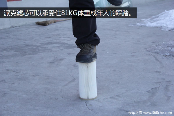 滤清器的强度非常重要,因为强度不足的滤芯在安装到滤清器内部之后就会发生变形的现象,很有可能造成内外腔连通,失去过滤功能。为了更直观的测试这个滤芯的强度,我特意请来了一位同事,站到滤芯上看看能否踩坏。