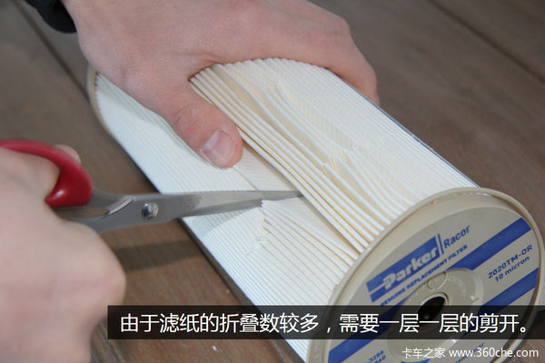 由于滤芯上下端盖的粘结特别的牢固,我们没办法从两边把端盖拆下来,所以只能选择从滤纸的中部用剪刀剪开,由于折叠层数非常多,需要用剪刀一点一点的剪,比较费力。