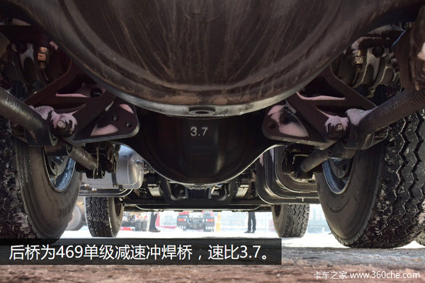 后桥为469单级减速冲焊桥,并采用少片簧设计,速比为3.7。