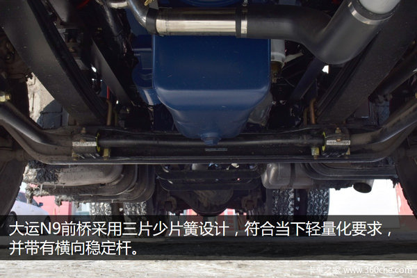 大运N9前桥采用三片少片簧设计,符合当下轻量化要求,并带有横向稳定杆。