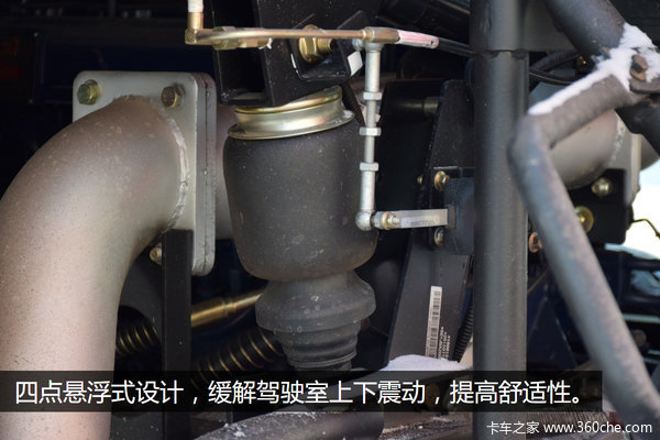 四点悬浮式设计,在发生冲击时,驾驶室整体后移可达20公分,同时还能缓解驾驶室上下震动,控制纵向摆动,提高舒适性。