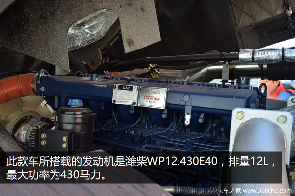 此款车所搭载的发动机是潍柴WP12.430E40,排量12L,最大功率为430马力,最大扭矩2060牛米(1000-1400rpm),通过SCR后排放处理技术达到国四标准。