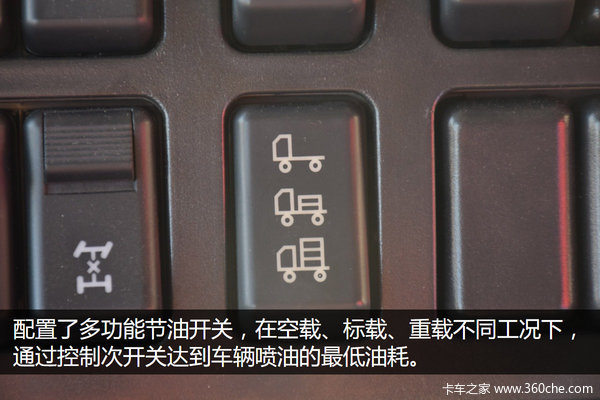 此款车还配置了多功能节油开关,在空载、标载、重载不同工况下,通过控制次开关达到车辆喷油的最低油耗。